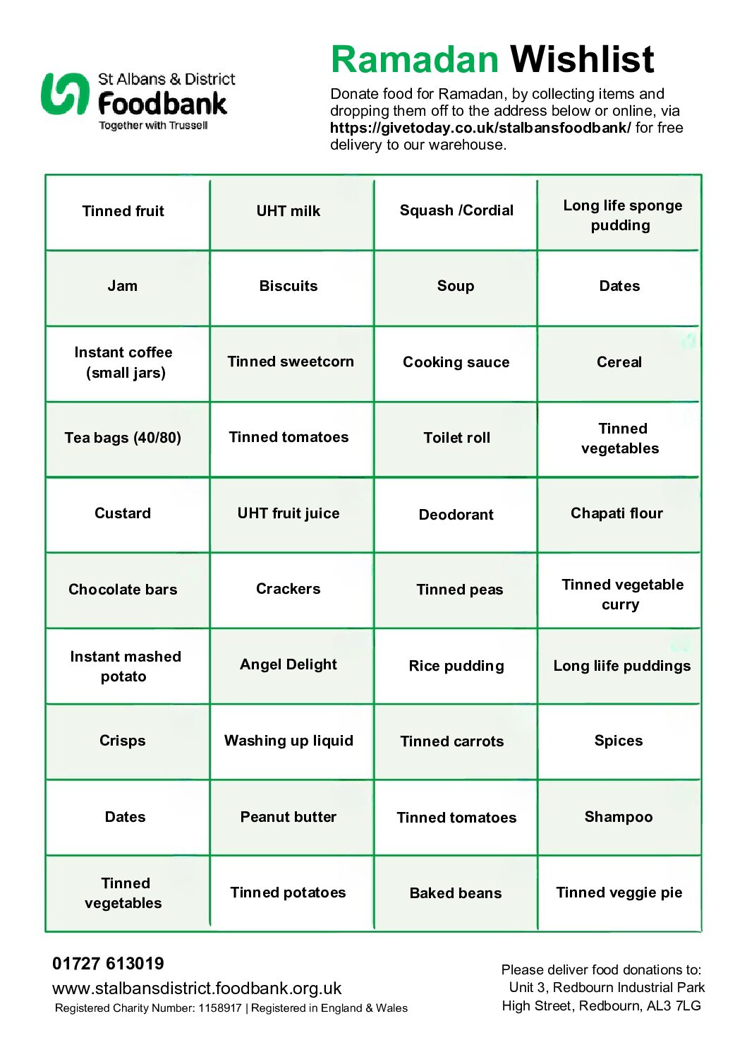 Here is our Ramadan wish list. Please deliver your donations to our warehouse in Redbourn, or make a donation online via givetoday.co.uk/stalbansfoodbank. Ramadan Mubarak.