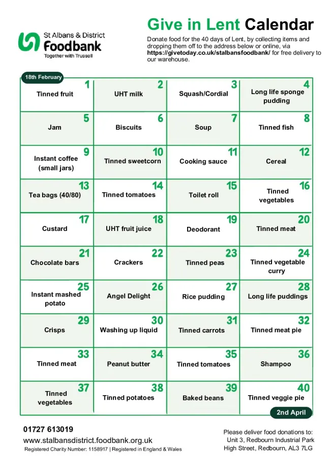 Here is our Lent calendar. Collect and donate an item each day from 18th February to 2nd April. You can then deliver your donation to our warehouse in Redbourn or online via givetoday.co.uk/stalbansfoodbank. Have a reflective and fulfilling Lent.